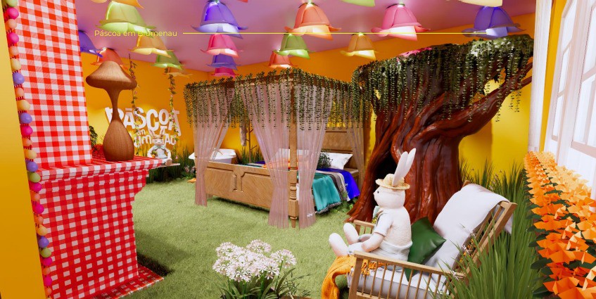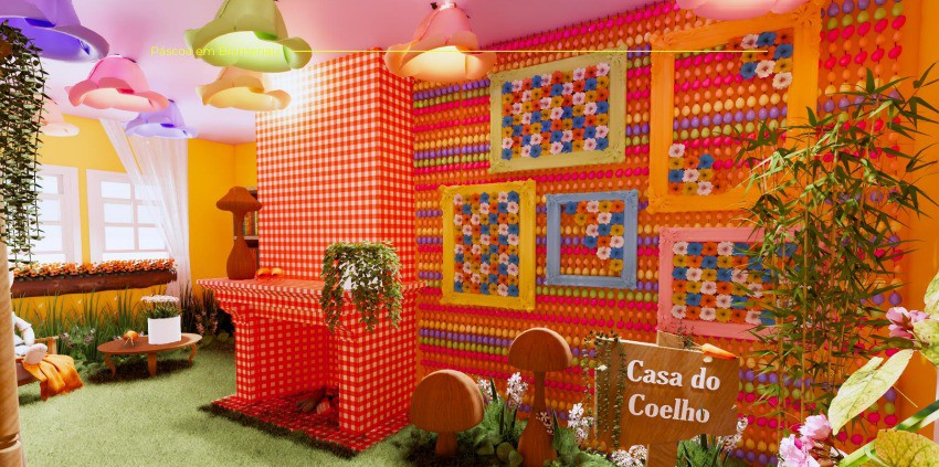 A cenografia da Páscoa conta com um ambiente lúdico, sensorial e afetivo, que convida o público a vivenciar uma experiência imersiva em um universo encantado. Entre árvores, flores e o aroma característico da natureza, surge um pequeno mercado mágico onde os coelhos se encontram para trocar ovos coloridos, flores, cenouras e chocolates artesanais, unindo o charme simples do campo ao acolhimento das tradicionais feirinhas do interior. Outro destaque é a Casa do Coelho, uma das atrações mais aguardadas, um ambiente completamente imersivo e decorado para encantar o público que espera pelo tão famoso Coelhinho da Páscoa.