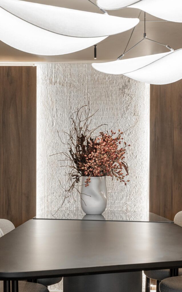 O ambiente é marcado por materiais que refletem as principais tendências da última Feira de Milão, destacando principalmente a presença da marcenaria e da marmoraria como protagonistas do ambiente.