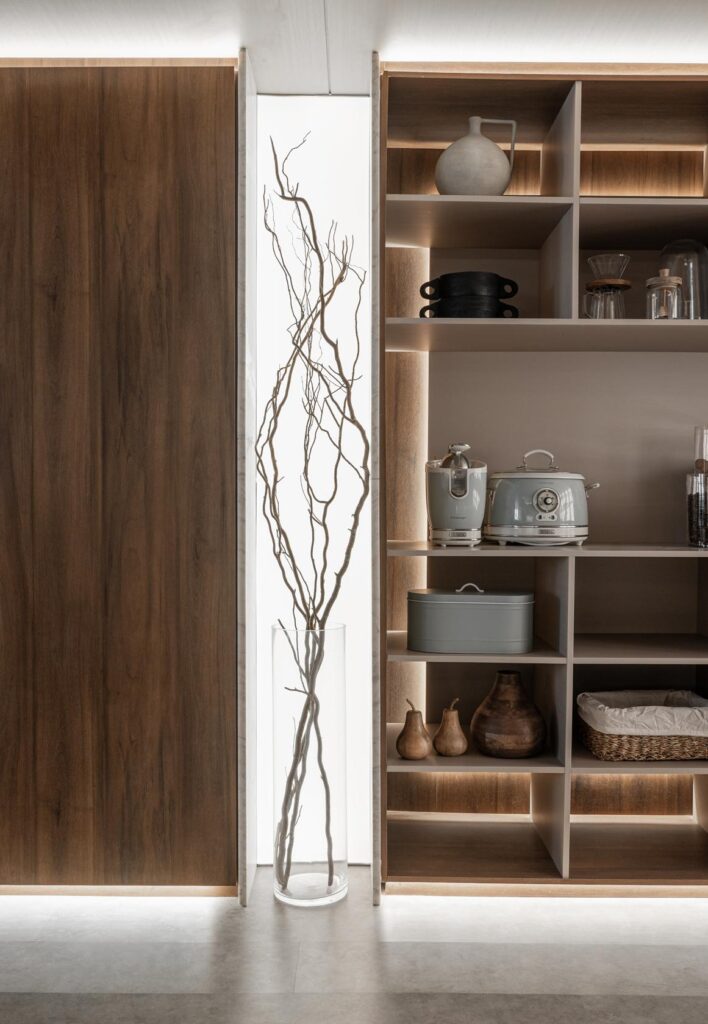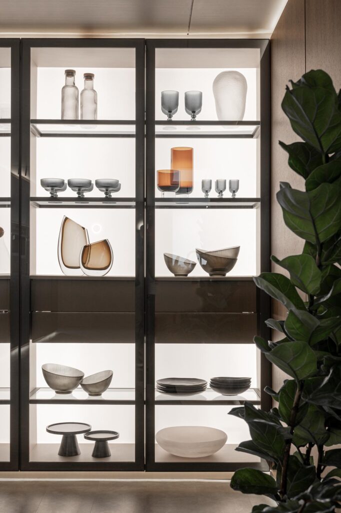 O projeto conta ainda com iluminação embutida em tela tensionada na cristaleira, proporcionando uma luz difusa de fundo. E, como destaque técnico e emocional, microspots direcionáveis iluminam pontualmente elementos como vasos, banquetas e objetos afetivos, criando focos de atenção e narrativa visual.