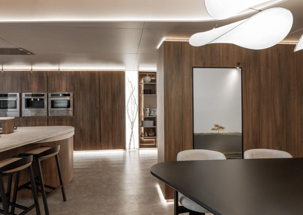 Fitas de LED percorrem o rodapé e o topo dos painéis e mobiliários, criando a sensação de que tudo flutua — painéis, armários e teto parecem estar suspensos, ampliando a leveza e o refinamento do espaço.