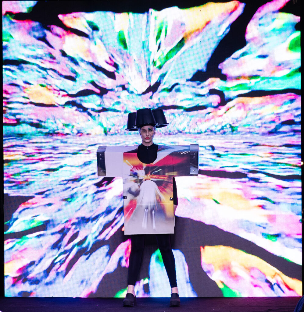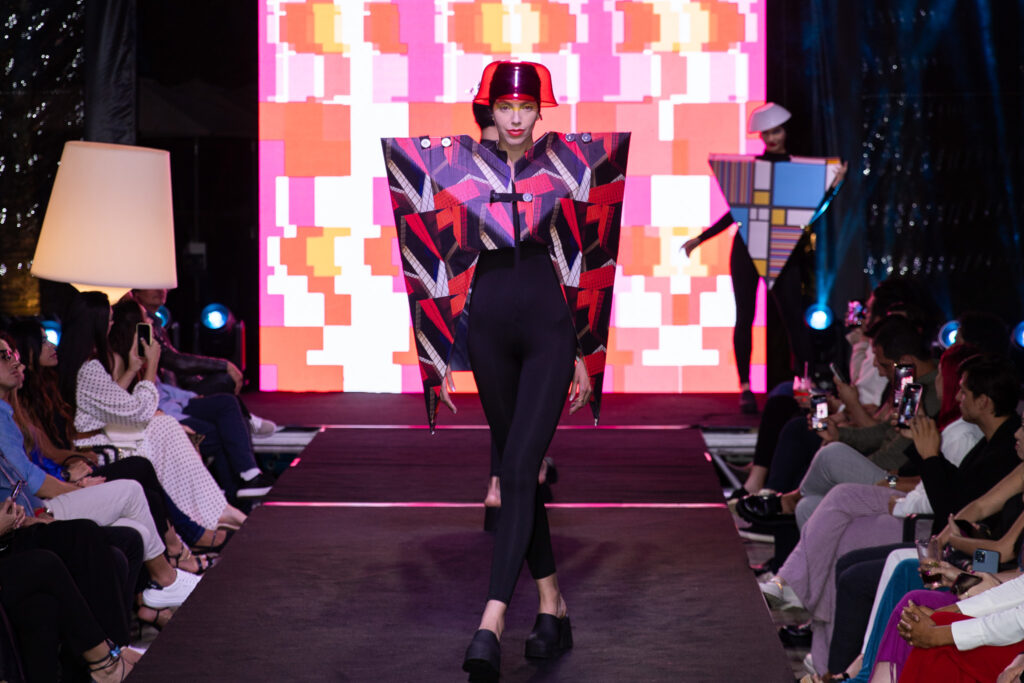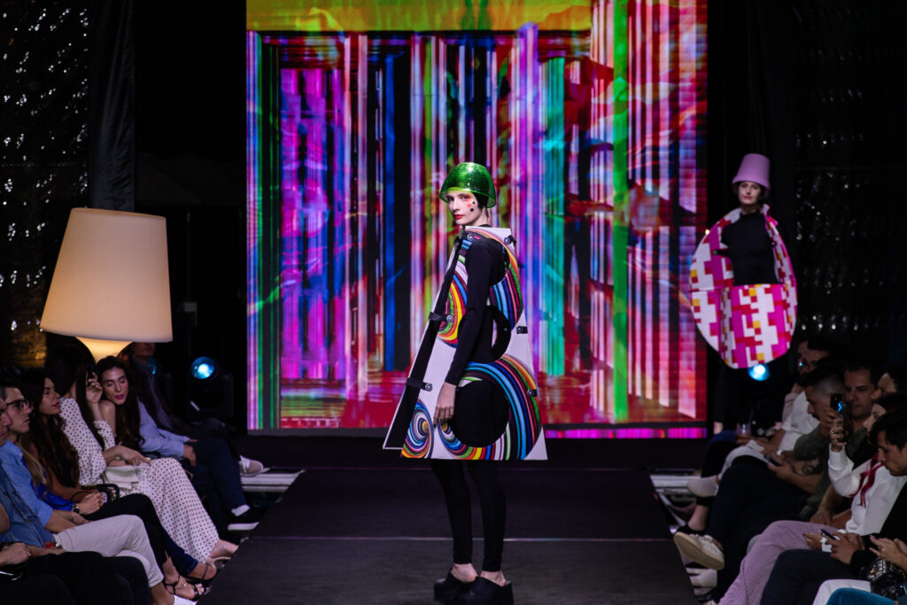 A programação começou com um desfile criado por J.C. Bergamo, que exibiu 20 peças estruturadas em papelão e telas estampadas com obras do casal. A passarela serviu como extensão conceitual da mostra, antecipando o diálogo entre ação, textura e geometria que guiaria o restante da noite. Na sequência, os convidados visitaram a exposição composta por 16 obras digitais impressas em canvas, desenvolvidas a partir de referências do Concretismo, Neoplasticismo, Minimalismo e do movimento Bauhaus. A disposição das obras e a relação entre figurino e imagem reforçaram uma leitura contemporânea sobre abstração e construção estética.