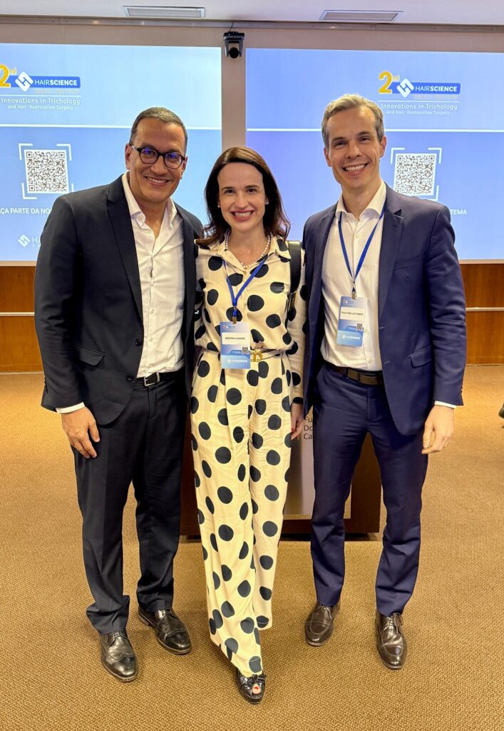 Ao longo do congresso, Débora Cadore dividiu o palco com referências reconhecidas no segmento, como o Dr. Pablo Cirino, que discutiu novas terapias regenerativas aplicadas à tricologia, e a Dra. Sara Pimentel, que apresentou casos clínicos envolvendo saúde capilar.