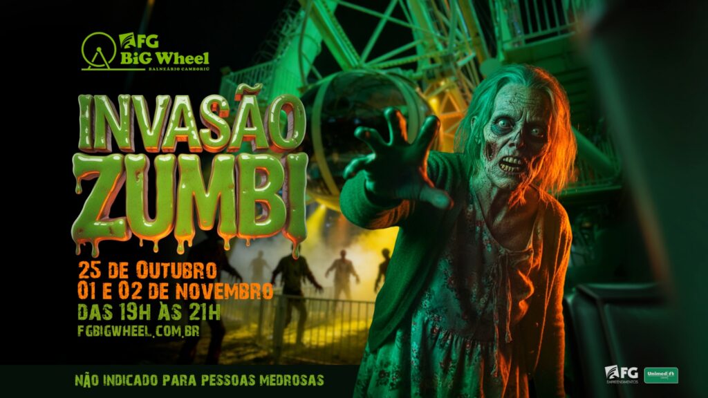 O Pontal Norte em Balneário ganha um toque de mistério a partir deste sábado. A FG Big Wheel celebra o Halloween com uma experiência que remete aos clássicos do terror. A Invasão Zumbi toma conta do complexo da roda-gigante nos dias 25 de outubro e 01º e 02 de novembro, sempre a partir das 19h.