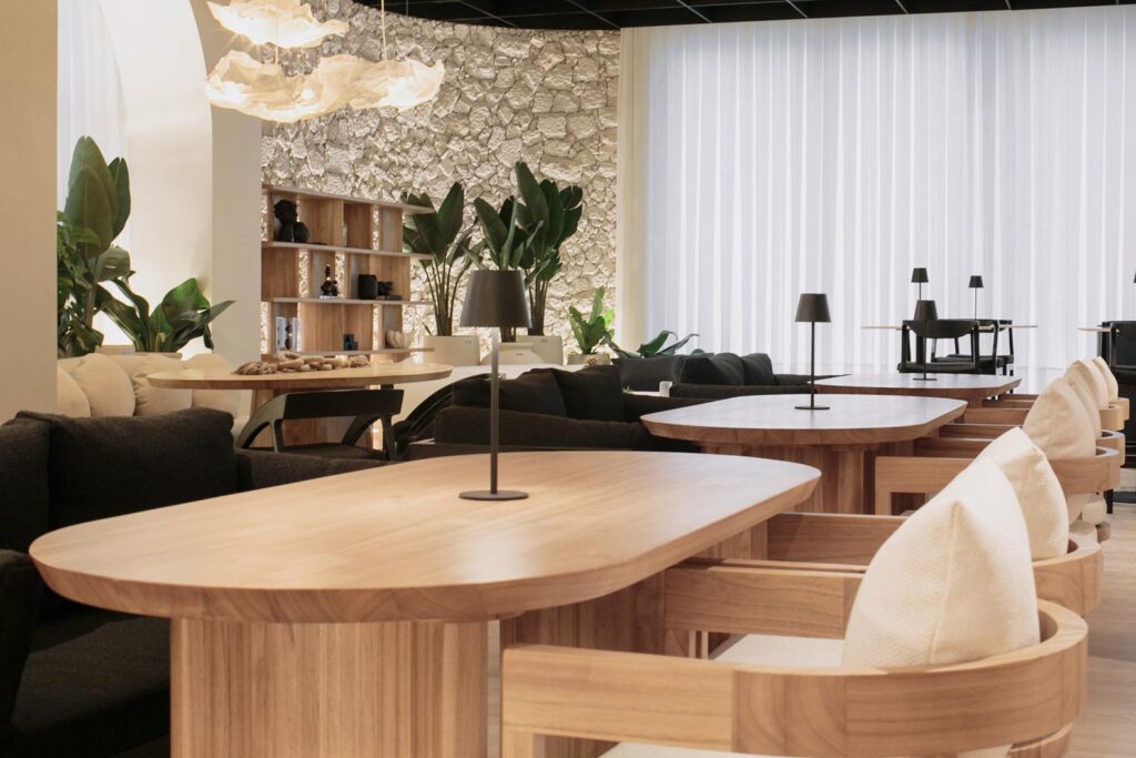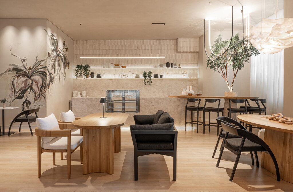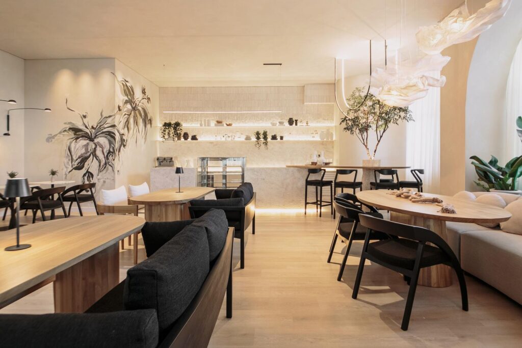 No espaço o layout flui naturalmente, com formas orgânicas e circulações amplas. O balcão fechado dá lugar a uma atmosfera de espaço gourmet residencial, onde você se sente recebido como em casa. De um lado, o café, ponto de partida das boas conversas; do outro, os vinhos, acompanhados por um lounge aconchegante e banquetas altas, que convidam a desfrutar o momento. Para a área de mesas, ela apostou num mobiliário confortável, sofás e diferentes formatos que quebram a formalidade e criam um ambiente dinâmico, autêntico.