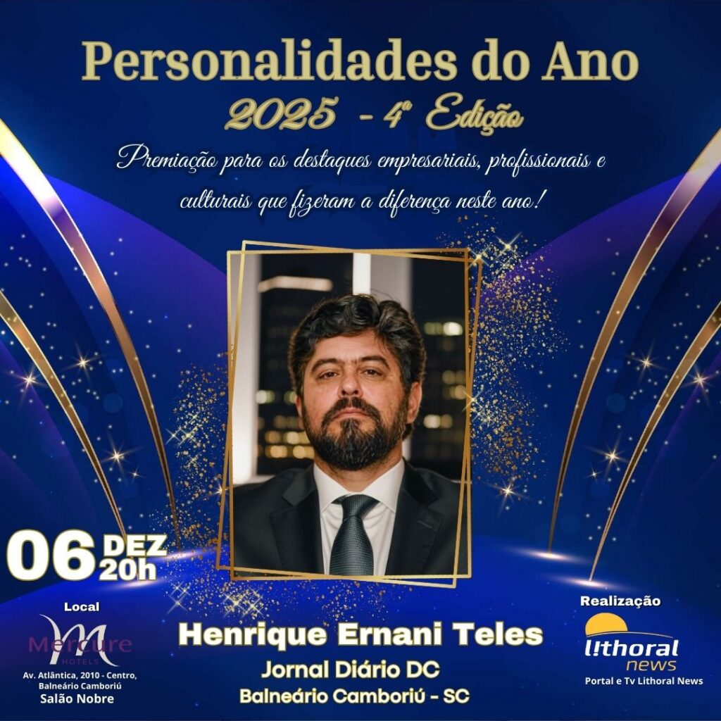 Agora, esse trabalho dedicado recebe um reconhecimento especial. No próximo dia 06 de dezembro, às 20h, Henrique Ernani Teles será homenageado no evento Personalidades do Ano 2025 – 4ª Edição, que celebra empresários, profissionais e lideranças culturais que fizeram a diferença ao longo do ano. A premiação acontecerá no Hotel Mercure, em Balneário Camboriú, reunindo nomes importantes do cenário regional.