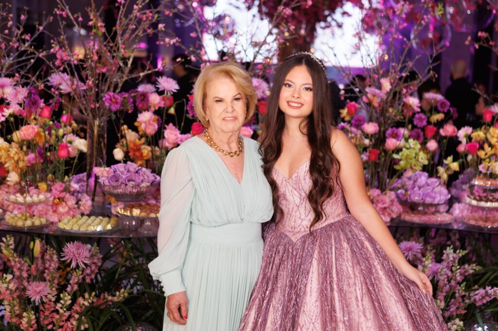 Um dos abraços mais especiais da noite: Luísa ao lado de sua avó Mariazinha Fernandes, celebrando com amor e ternura seus 15 anos.