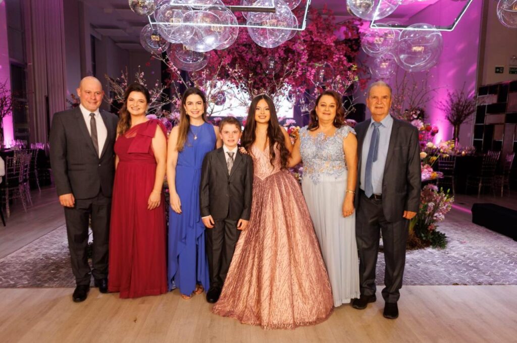 Jefferson Paes, Franciana Paes, Francine Sá, Arthur Paes, Eliana Sá e Francisco Sá, tios de Luísa Paes Fernandes, prestigiando com muito carinho e alegria os 15 anos de sua sobrinha em uma noite repleta de emoção, elegância e união familiar.