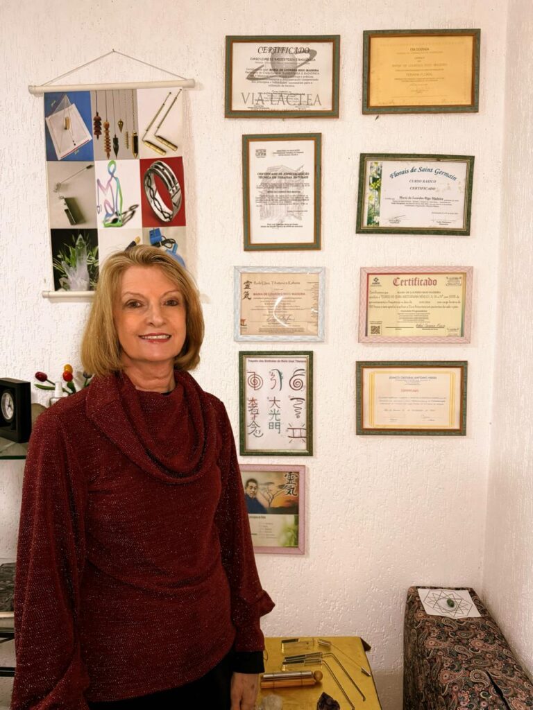 Além dos atendimentos individuais, Maria de Lourdes também é formadora de novos terapeutas. Ela oferece cursos livres em Florais, Aromaterapia, Radiestesia, Cristais, Cromoterapia e Reiki — conteúdos elaborados com base em teoria, prática e vivências energéticas reais. São cursos acessíveis tanto para quem deseja atuar no campo holístico quanto para quem busca desenvolver o próprio processo de autoconhecimento.