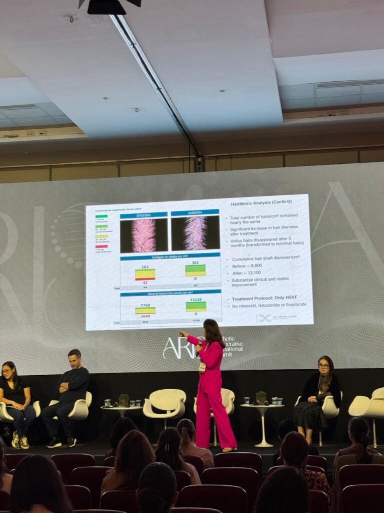 No sábado, em sua palestra, a médica catarinense abordou o tema “Uso de células da gordura no tratamento das alopécias”, apresentando o que a ciência revela sobre o assunto e como essas descobertas são aplicadas na prática clínica diária. Segundo a especialista, pioneira no mundo nesta técnica, o tema é fundamental, pois evidencia que já existem terapias regenerativas eficazes para doenças antes consideradas sem solução.