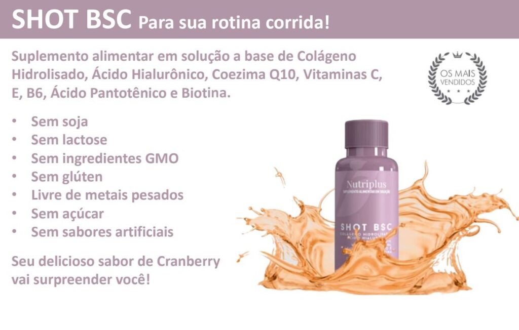 Na sequência da rotina, entra o Shot BSC Nutriplus, um suplemento alimentar em solução pensado para quem valoriza praticidade sem abrir mão do cuidado. Em doses prontas para consumo, o shot reúne colágeno hidrolisado, ácido hialurônico, coenzima Q10, além de vitaminas C, E, B6, ácido pantotênico e biotina.
