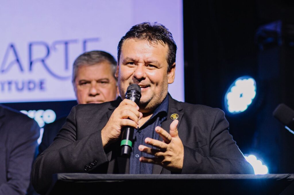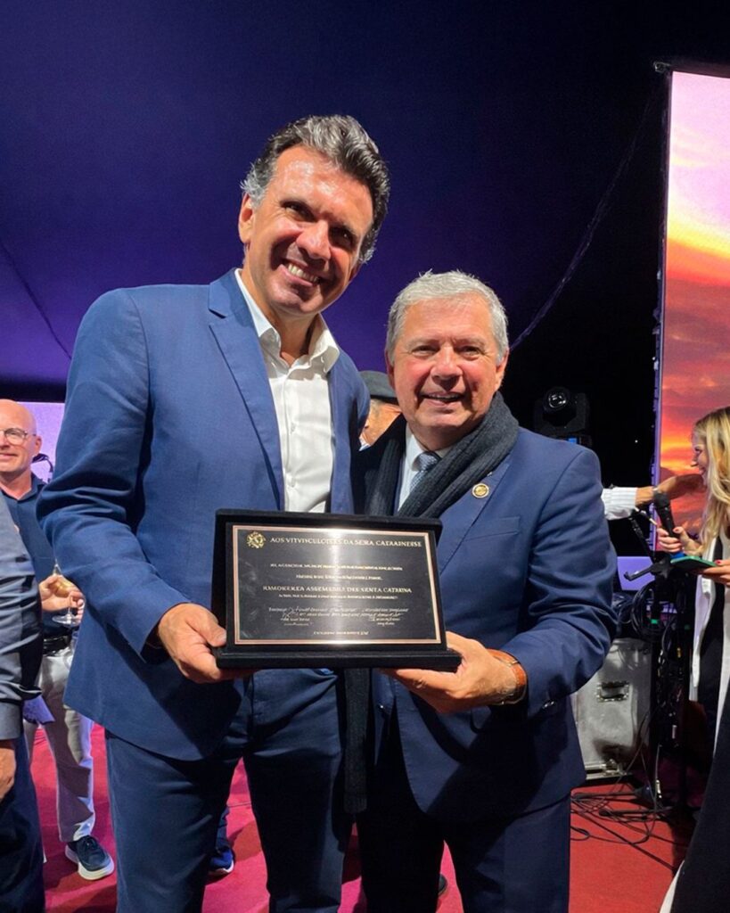 Durante a cerimônia, o deputado estadual Mário Motta entregou uma placa em homenagem aos vitivinicultores da Serra Catarinense. Ao destacar o desafio de cultivar vinhedos acima dos 900 metros de altitude, enfrentando frio intenso, geadas e as particularidades do clima serrano, o parlamentar parabenizou os produtores que acreditaram no potencial da região. “Produzir vinho nessas condições exige conhecimento, persistência e paixão pela terra. Os produtores da Serra Catarinense mostraram que é possível transformar desafios em excelência, levando ao Brasil vinhos que carregam qualidade e identidade”, disse.