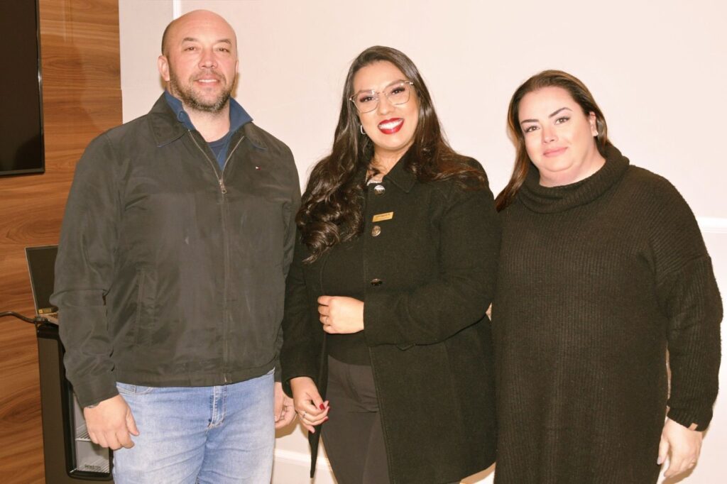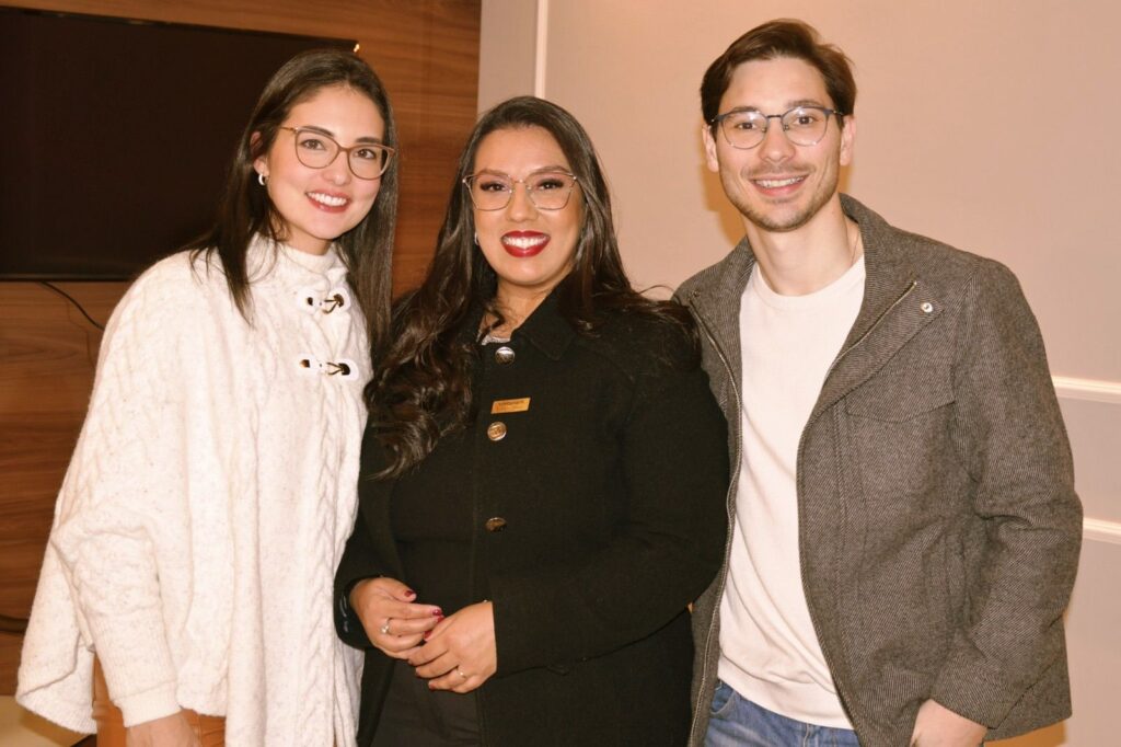 Dra Gabriela Paes ao lado da anfitriã Carolina Furlan e seu esposo João Renon em um evento marcado por conexões, boas conversas e grandes oportunidades