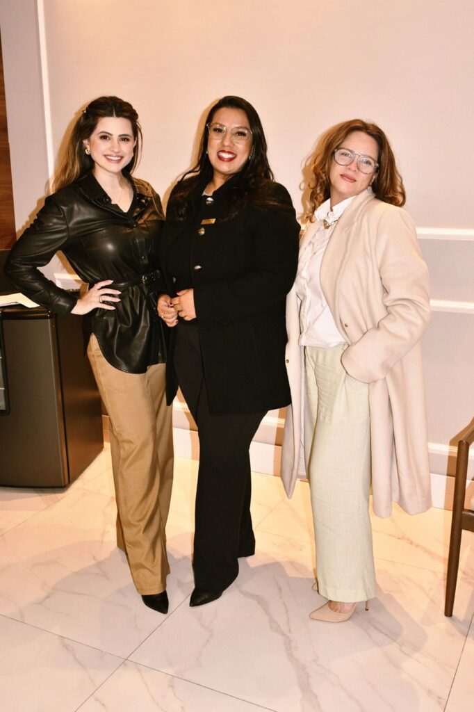 Esta colunista ao lado de Carolina Furlan e Bettina Mesquitta em uma noite marcada por conexões, elegância e novos projetos no cenário imobiliário.